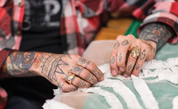 Mitchell himself is an arresting man, his appearance as fascinating as his work. He’s covered with tattoos—even his face, where ink peeks out from his salt and pepper beard. The day of my visit to his Capitol Hill studio, he’s wearing a black T-shirt depicting extra-hirsute versions of the members of KISS. It’s KISS and Planet of the Apes melded together, he explains, a favorite piece he purchased at a vintage shop years ago. The rest of his ensemble includes camo pants, a red kerchief tied around his neck and worn leather moccasins decorated with little beaded skulls in headdresses.