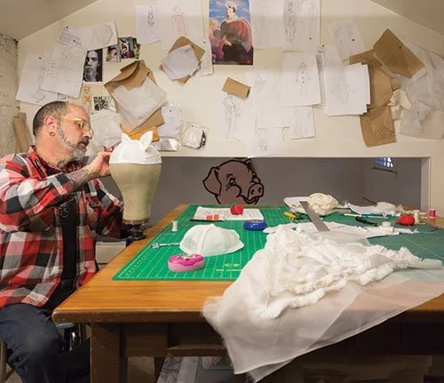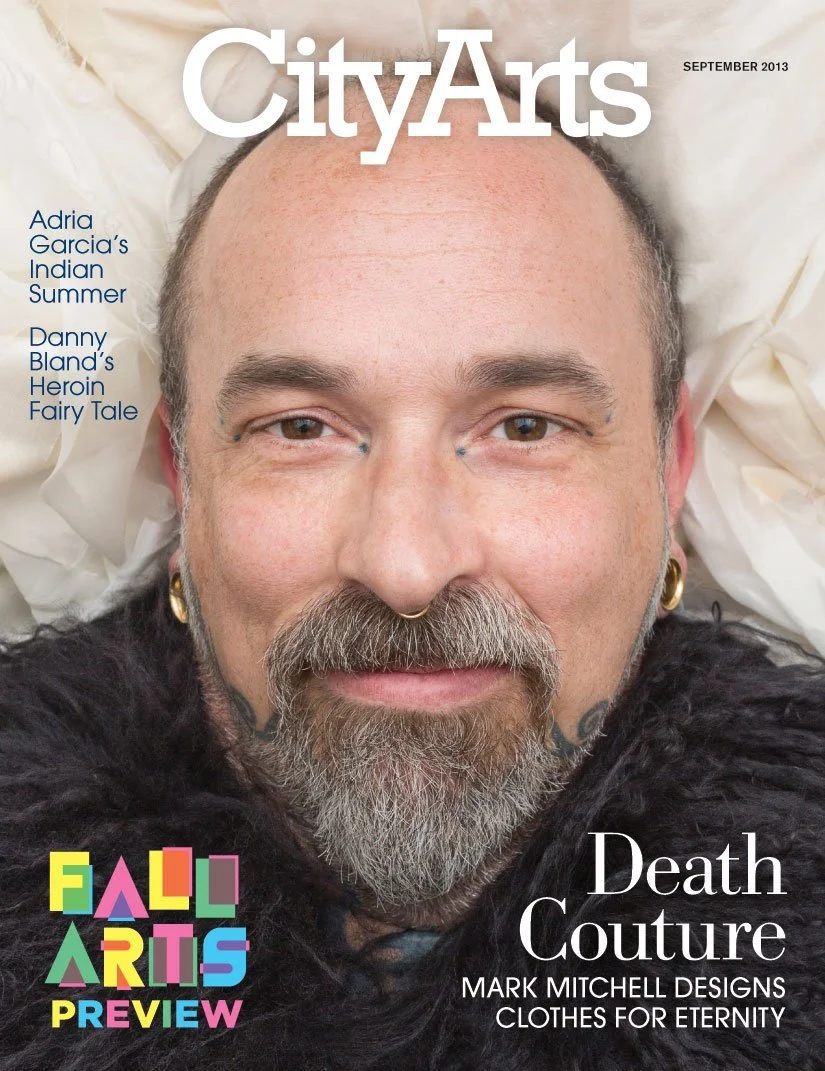 Mitchell’s ongoing relationship with death isn’t a fling. He grew up in a conservative, small town in central Illinois—“a red, red town.” His father was a union man who dabbled in local politics and became mayor for a year when Mitchell was in grade school. Mitchell was more creative than political; he preferred sneaking around, trying to teach himself to sew, knit, crochet—something not smiled upon as a pastime for little boys.