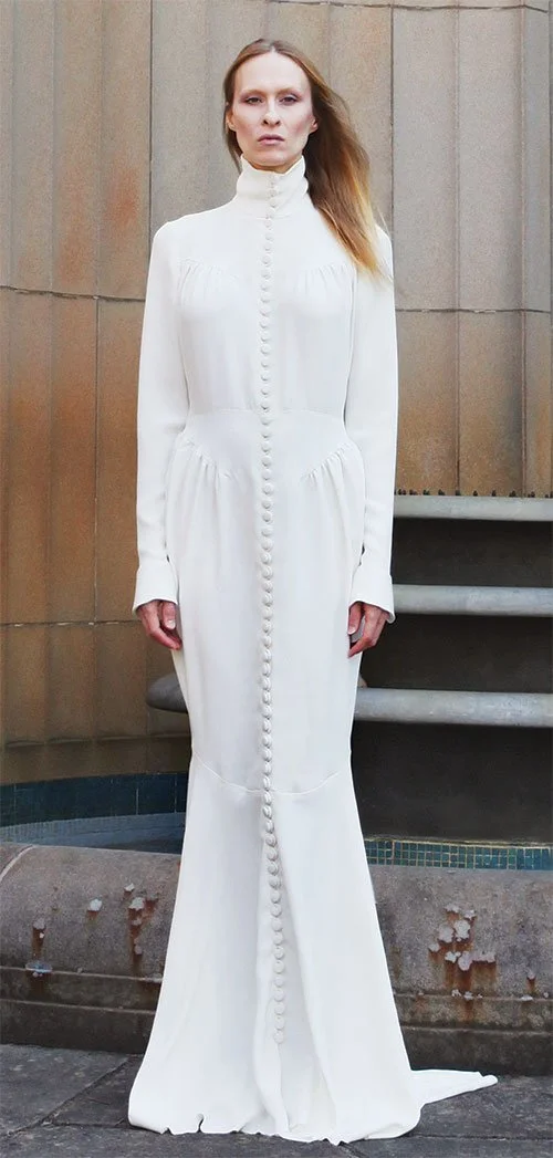A few fundamentals are consistent throughout the collection. One is the use of silk, the primary material for all the looks and a traditional element in ceremonial and ritual clothing. He’s also very conscious of how his materials are sourced: Everything is 100 percent natural and renewable, down to the smallest detail. For example, the 84 handmade wooden buttons running up the front of one gown, from neck to hem, are each painstakingly covered in silk and fastened with handmade loop closures.