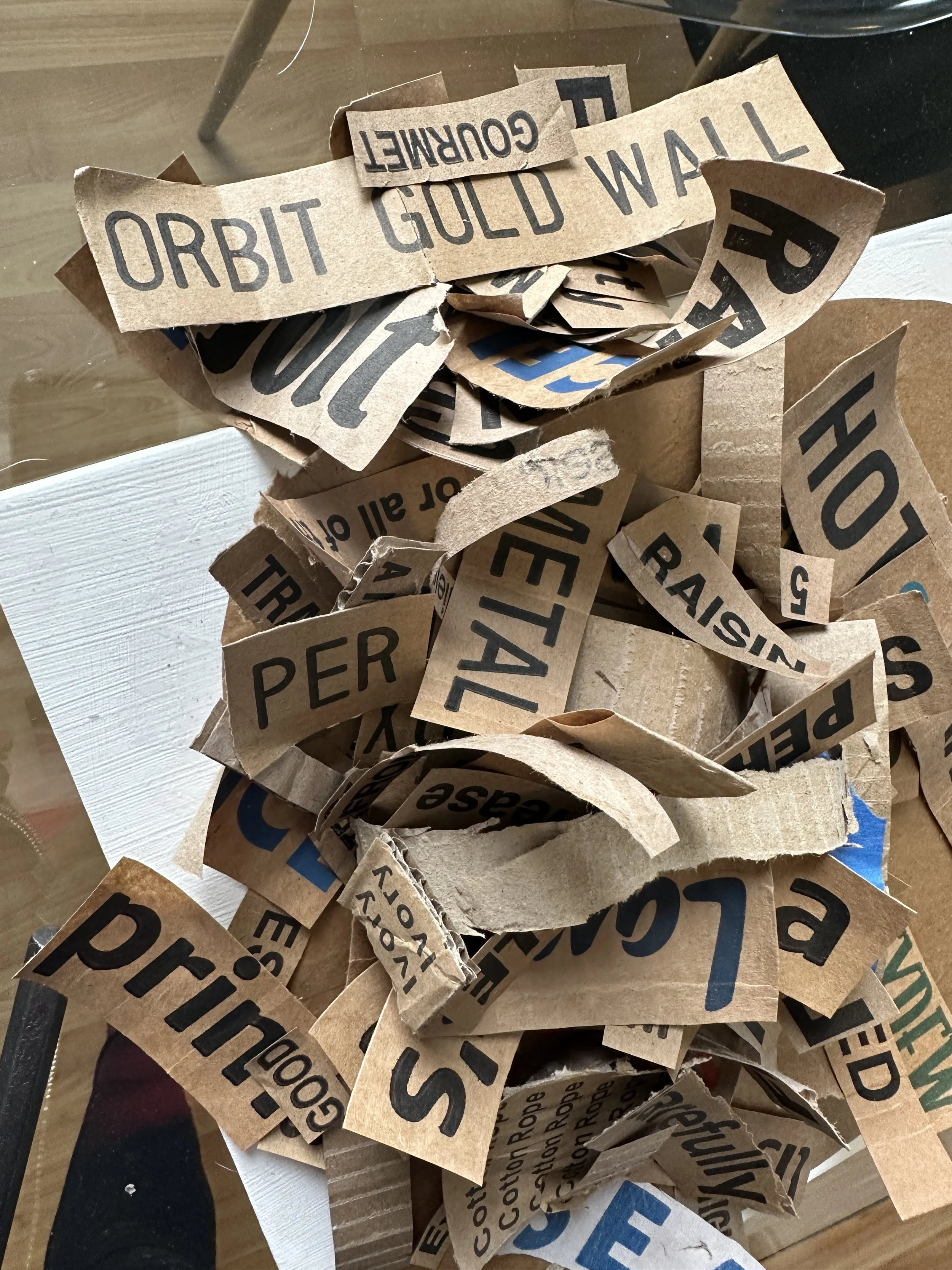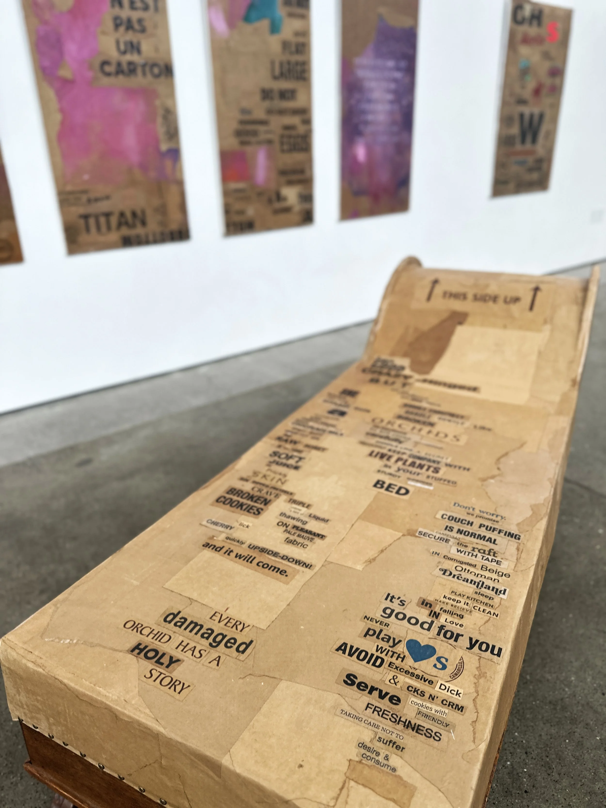 The concept for this work evolved over four months working as artist in residence at King County Recology, where narratives were pieced together with text and images excised from cardboard boxes collected at Recology’s Material Recovery Facility. The work that emerged during that time reflects a poetics of consumption, seduction, and instruction inherent to packaging. Not quite paintings or poems, these things are descended from poetry concrete, with words scraped, stripped, rebuilt, sealed in hard gloss. Lines are not linear, but meander like an automatic drawing. A series of small poems run the gamut of textual chance encounters and word happenings, some dowsing for meaning while others relish in pure pleasure of mouthfeel. A fainting couch, re-built entirely of cardboard on the frame of an antique chaise, is a nod to the febrile spirit of consumerism in Zola’s Au Bonheur des Dames, while offering a moment of respite for the weary cultural glutton, the consumer of art.