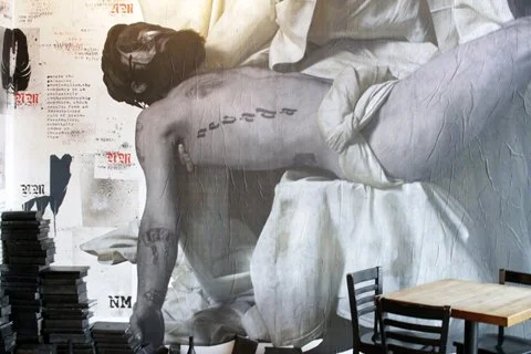Because of this, an installation for public consumption seems a bit counterintuitive, and there’s a chance the work will come across as affected or inaccessible—except for the fact that New Mystics are rooted in the tradition of street art and view the city, and by extension all shared space, as a playground for inspiring experience. Emphasis on shared transcendence is the thread running through MYTH&MURDER that connects the values of their esoteric body politic to the random public who enter the gallery. Transcendence can be quotidian. It can take place unexpectedly, around any given corner in broad daylight.