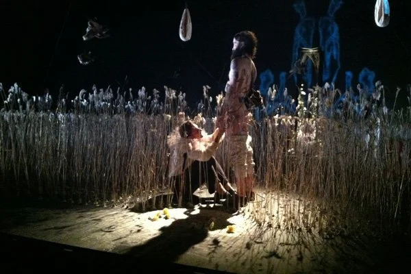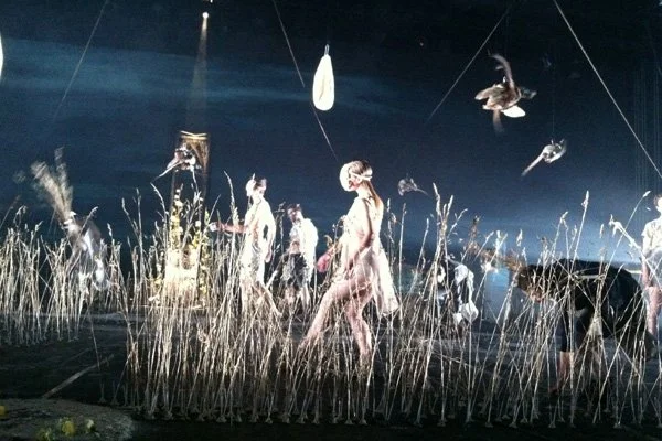 One notable thing about Rites is all the spinning. So much is spinning: the dancers, their arms outstretched, the pheasants on a wire, their wings splayed. It occurs to me that everything on the set is a timepiece, crudely marking out a dizzying rotation. Everything a whirling dervish or a clock. Time not linear, but cyclical. I think of Nietzsche’s eternal return.