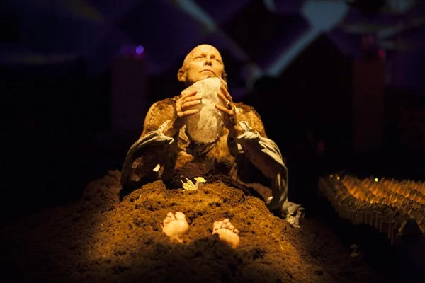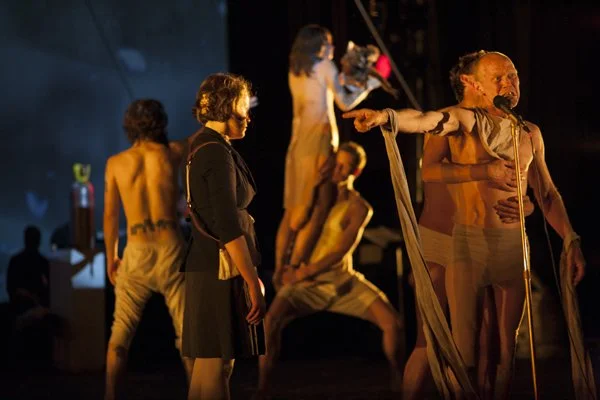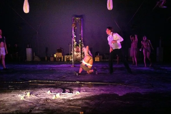 In the third act, dancer Alan Sutherland claws his way out from a mountain of soil under which he’s been buried for around five hours. Many in the audience have no idea he was there in the first place. He’s sobbing and dirty. He laps up the water Mitchell offers him. Then the wine. He wails about frail ghosts, death, love. In the final throes, while Kate Ryan belts an operatic hymn amidst climactic chaos, three nooses are lowered from the rafters and Sutherland and dancers Calie Swedberg and Jessie Smith are hoisted up, ropes around their neck. But death won’t come, and they’re finally released.