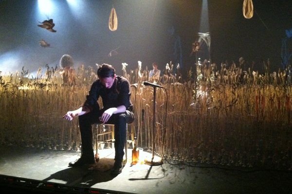 It’s 7:10 pm Sunday night at On the Boards and Mitchell is seated on a wicker chair, front and center stage. Behind him, an artificial field of wheat sways. Stuffed pheasants hang from the ceiling on motorized wires, spinning. Mitchell’s fingers limply clutch a glass of red wine. I’m sitting almost directly in front of him, and though his bloodshot eyes lock on mine sometimes, I’m pretty sure he can’t see me. His shirt sleeves are rolled up and two engorged leeches dangle from his right arm. Rivulets of blood run down his fingertips onto the floor. “Fuuuuuck!” he moans, after forcing down mouthful after mouthful of red wine. Saliva dangles from his lips. He spits. His eyes roll back. He gets up, turns around, pulls down his pants and pisses into an empty wine bottle, filling it almost half full.