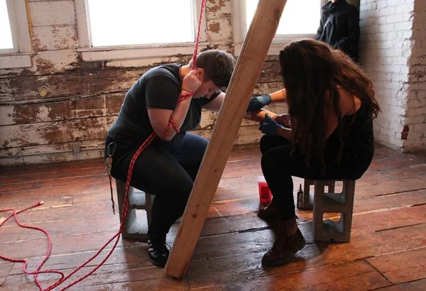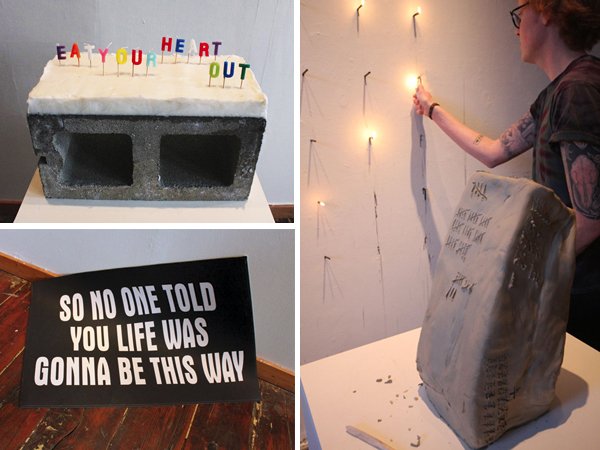 In the gallery were a slew of romantic declarations, or, as per the statement, “sculptural sketches of the things that bind us together, and of the things that keep us apart.” There was a cinderblock birthday cake topped with five pounds of lard frosting and candles that spelled “EAT YOUR HEART OUT.” Across the gallery, a block of clay with a 37 hash marks carved into the surface represented the number of people Porritt and Pinton had collectively slept with. Its title: You’re Number 37, Have a Look. Visitors were invited to carve their own number into the block and light one of 37 black candles on the wall behind the block, and many had. But all that was on the periphery, and at the moment I arrived, the performance taking place in the middle of the room had everyone hushed. It was more than the simple tattoo exercise I’d expected. An exhausted Porritt was slumped over, cheeks flushed, one arm trembling and clinging to the end of a red rope. Her other arm was inserted through a hole cut in a wall the artists had built in the gallery. This wall was unsupported except for Porritt, who was holding it up. The red rope she had wrapped around her free arm was looped through an anchor in the ceiling and at the other end attached to the top of the structure.