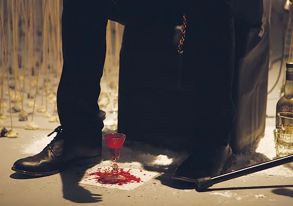 In 2011, Implied Violence changed its name to Saint Genet and staged an epic, four-part operatic performance called Transports of Delirium. At the start of the first show, Mitchell’s wrists, hands and white cuffs were covered with blood. Leeches had drained him for four hours leading up to the performance; he’d thinned his blood by drinking alcohol steadily. For the ensuing four or five hours, performers were instructed to breathe in and out of balloons filled with nitrous, suffocating on it till they stumbled around the stage in a trance, or danced, a slow-motion, hysteric tarantella. Mitchell’s violence—in the form of maddening feats of endurance and dominance—is the means to a specific end.