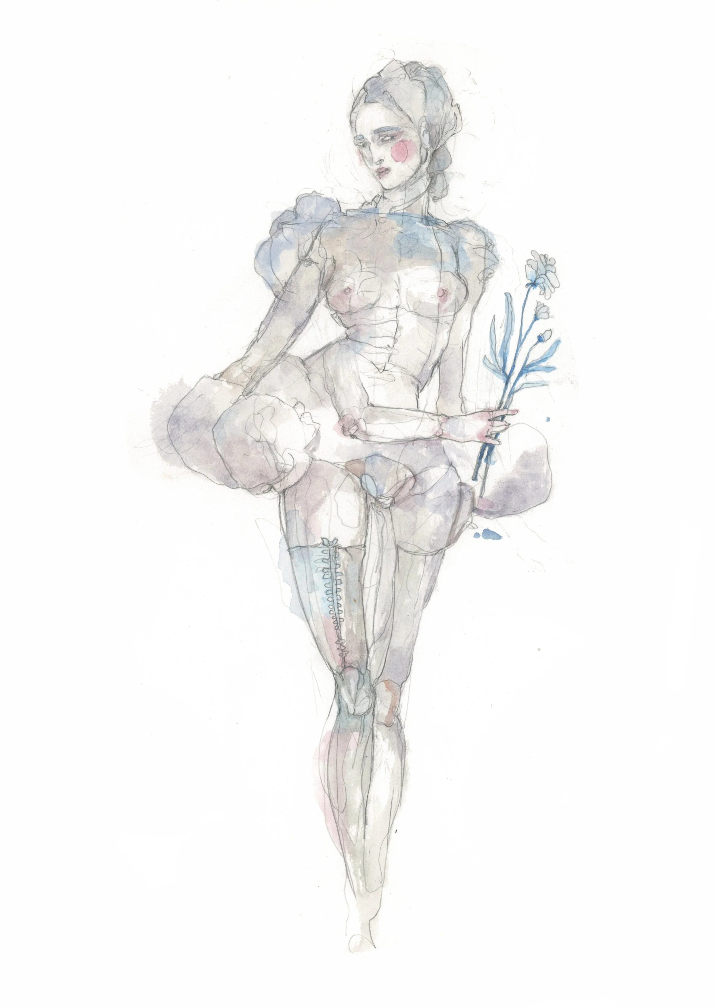 Picking up old scraps of paper again to watercolor half-drawn figures, ghostings built on a wobbly armature of graphite contours.