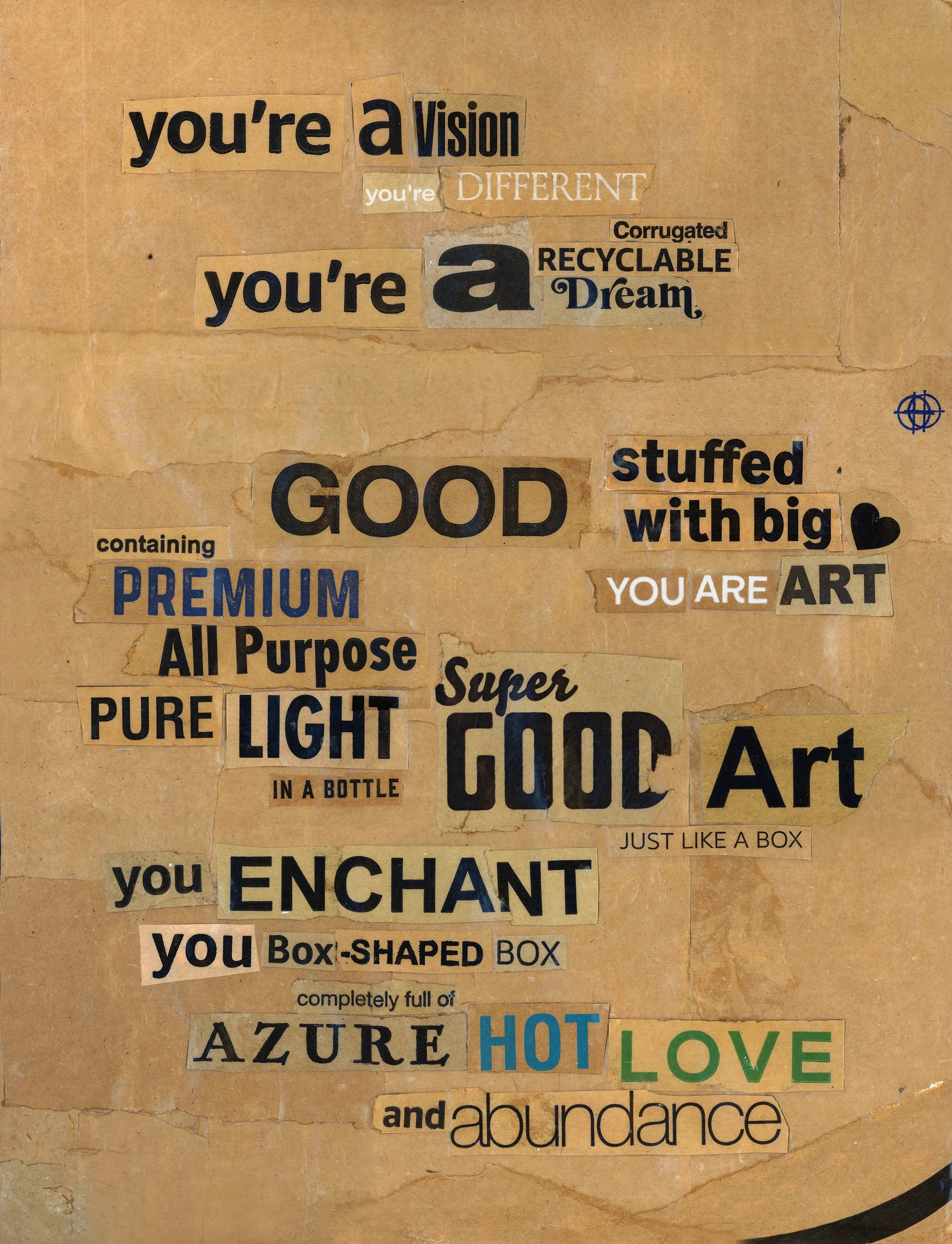 Another one, strip-mining the thin sliver of text off corrugated depths. When I talk about the text on boxes I talk about the mingling language of seduction and violence. They congregate and stand at odds, about-face every which flap, every this-side-up and this-side-down. There is always a right way to do something to a box. Or not do. Do not crush, do not stack, do not cut. One must keep refrigerated, handle like ice cream, handle like eggs. Everything is fragile, always, even the really rock hard steely stuff: once it goes in the box it assumes a preciousness and fragility like glass. There are knives everywhere on the box, blades with short handles, and there are hands. There are lots of box bodies lifting with their legs and not their backs. Group lift preferable, sometimes required. The most amazing part of box language is that, if you are to believe the box, every single unique box definitely holds the most amazing precious wonderful cargo. The ultimate, the sweetest, the sexiest broccoli, the most impossibly premium protective pleasurable carseat or gas grill, the freshest, goodest, greatest, radiant, premium crinkle cut potato fries. Et cetera. It is a dizzying alphabet of desire.